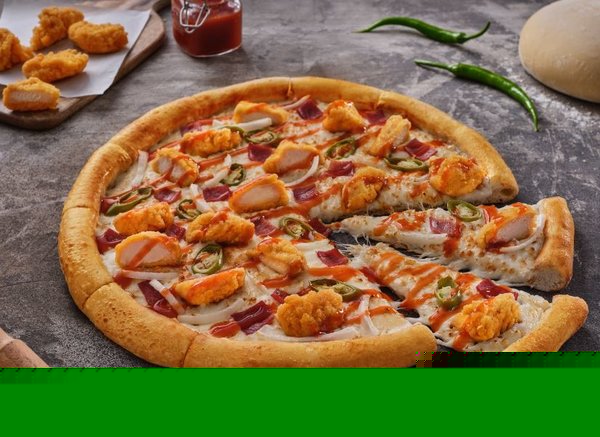Grilled chicken, chicken sausage, chicken pepperoni, fresh mushroom, onion, green pepper and black olives