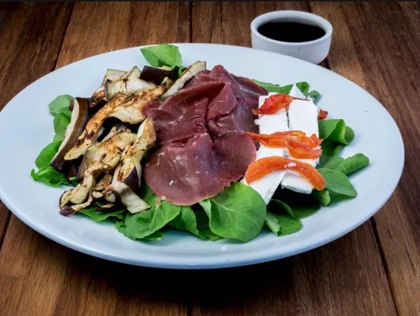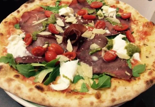 Sapori tomato sauce, superior bersoloa beef, organic cherry tomato, fresh rucola, Italian basil and homemade mozzarella cheese