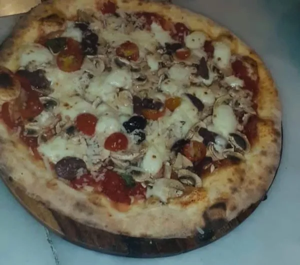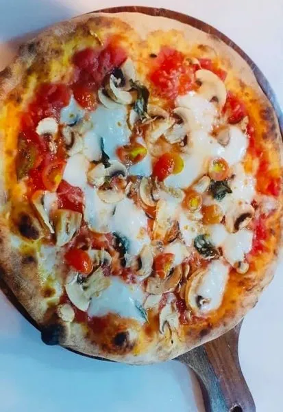 Sapori tomato sauce, fresh mushroom, organic cherry tomato, Italian basil, homemade mozzarella and kalamata olives