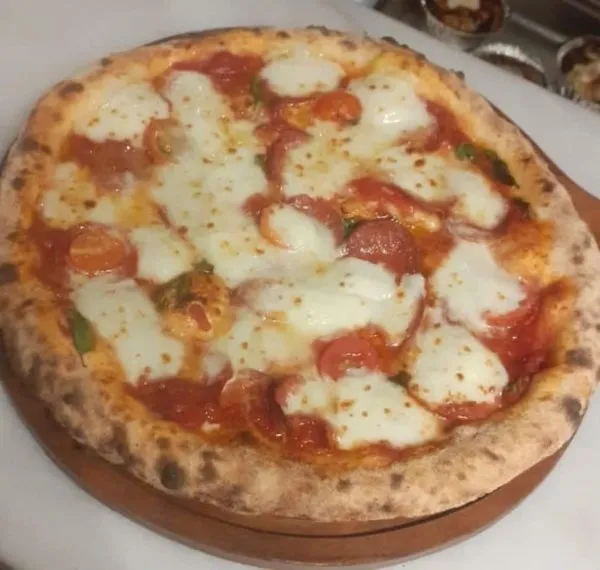 Sapori tomato sauce, superior beef salami, homemade mozzarella cheese, Italian basil and organic cherry tomato