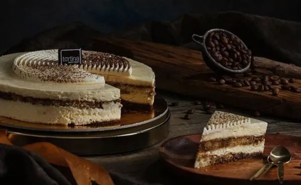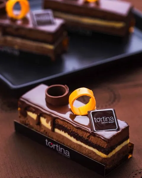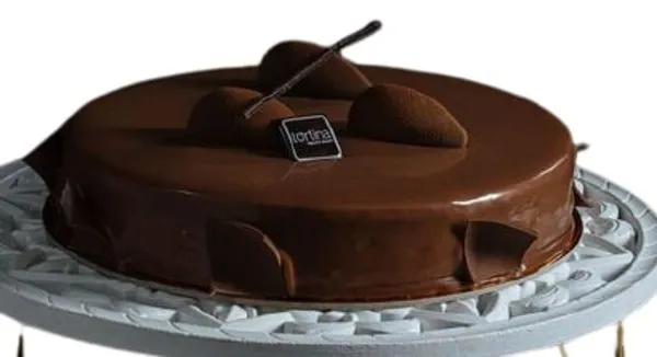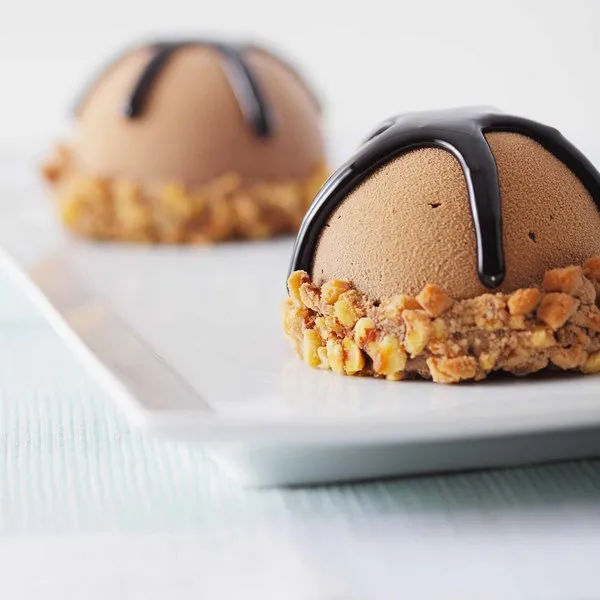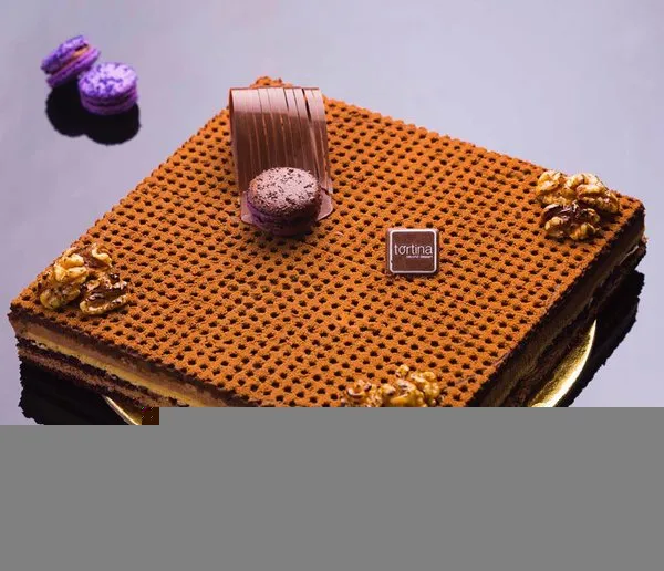 Butterscotch cake base, walnut, milk chocolate ganache and white chocolate sauce