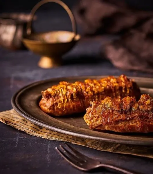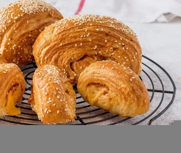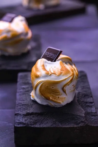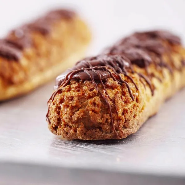Crispy choux pastry filled with caramel pastry cream and topped with almond