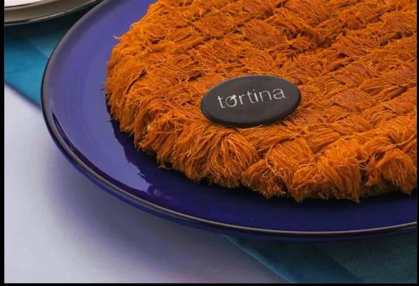 Chocolate sable crust, crispy biscuits, feuillentine, walnut mixture, cream cheese and caramel topping